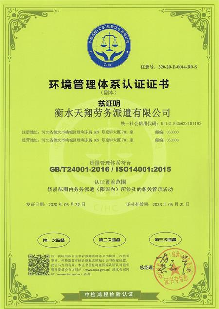 環境管理體系認證證書